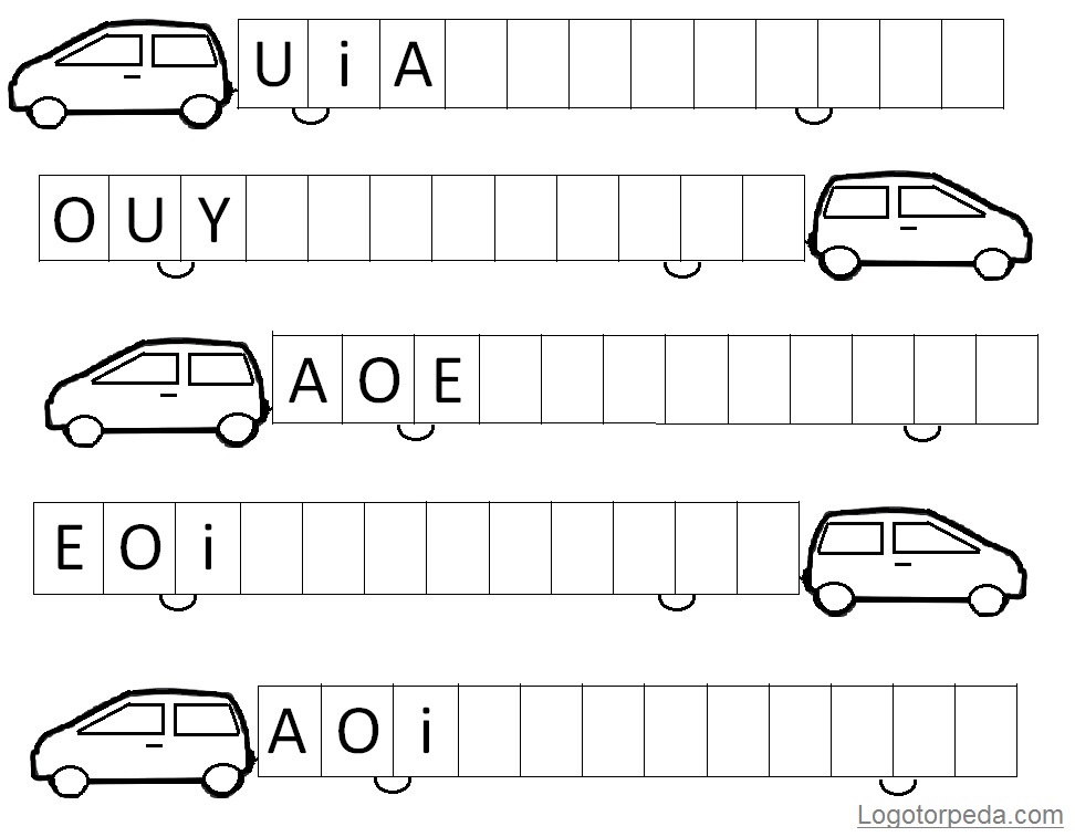 Samochody ciągną długie przyczepy, z których powypadały samogłoski. Były one ułożone zgodnie z określoną kolejnością. Czy potrafisz ułożyć je tak samo?