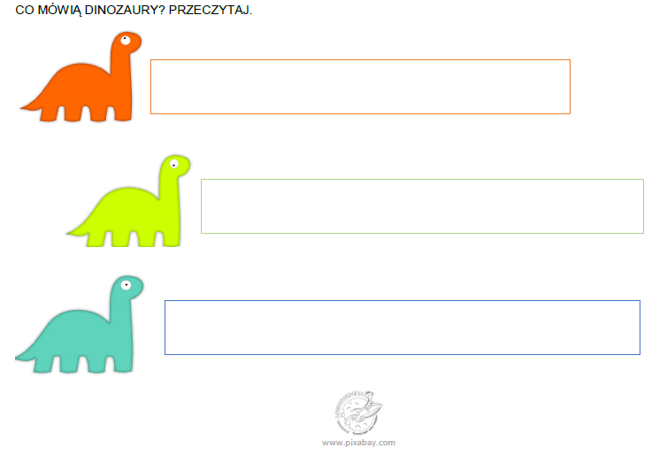 Karta pracy zawiera rozmowę trzech dinozaurów. Każdy z nich mówi inne słowa, które składają się wyłącznie z samogłosek. Można je porozcinać lub pozostawić w formie jednej planszy.