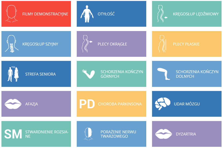 Na stronie e-terapie.pl znajdują się przede wszystkim treningi wspierające proces rehabilitacji: ćwiczenia kończyn górnych i dolnych, kręgosłupa i pleców. Nie brakuje też ćwiczeń, które wspierają dobre samopoczucie osób starszych, a także tych, które wykorzystuje się podczas rehabilitacji osób po udarze czy z chorobą Parkinsona, po porażeniach nerwu twarzowego i dyzartrii.